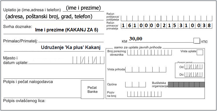 Svrha plaćanja: upisati ime i prezime takmičara pa KAKANJ ZA 5 (npr. Tuka Amel KAKANJ ZA 5)