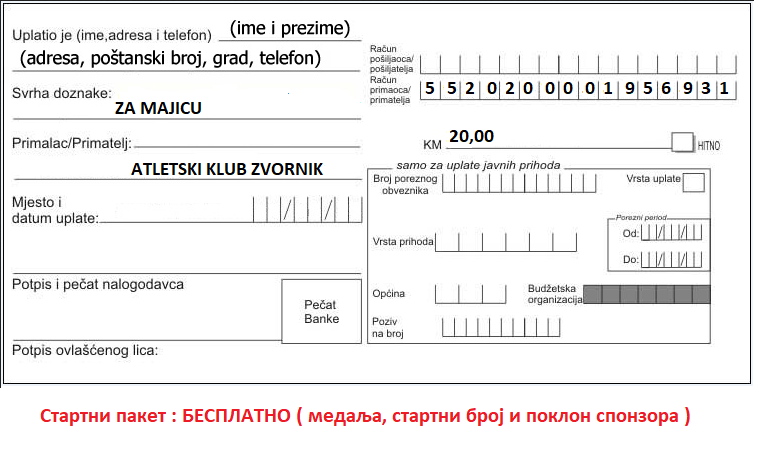 Уколико неко хоће мајицу плаћа се 20 км и мора величину назначити у пријави .Плаћање мајице може се извршити уплатом на ЖР : 5520200001956931 у сврху уплате за мајицу или на лицу мјеста сат прије старта трке.